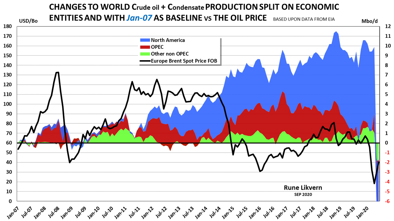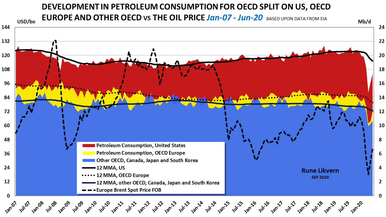 Since the summer of 2011, and primarily due to the rapid growth in US LTO, OECD (C + C) production increased with more than 50% as per Apr-20.