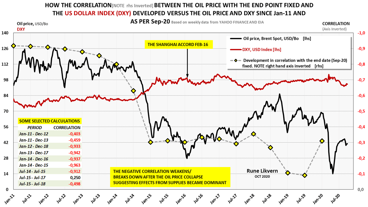 The correlation calculations between the oil price and the DXY for Jan-00 to Sep-20 came out at 0,78.