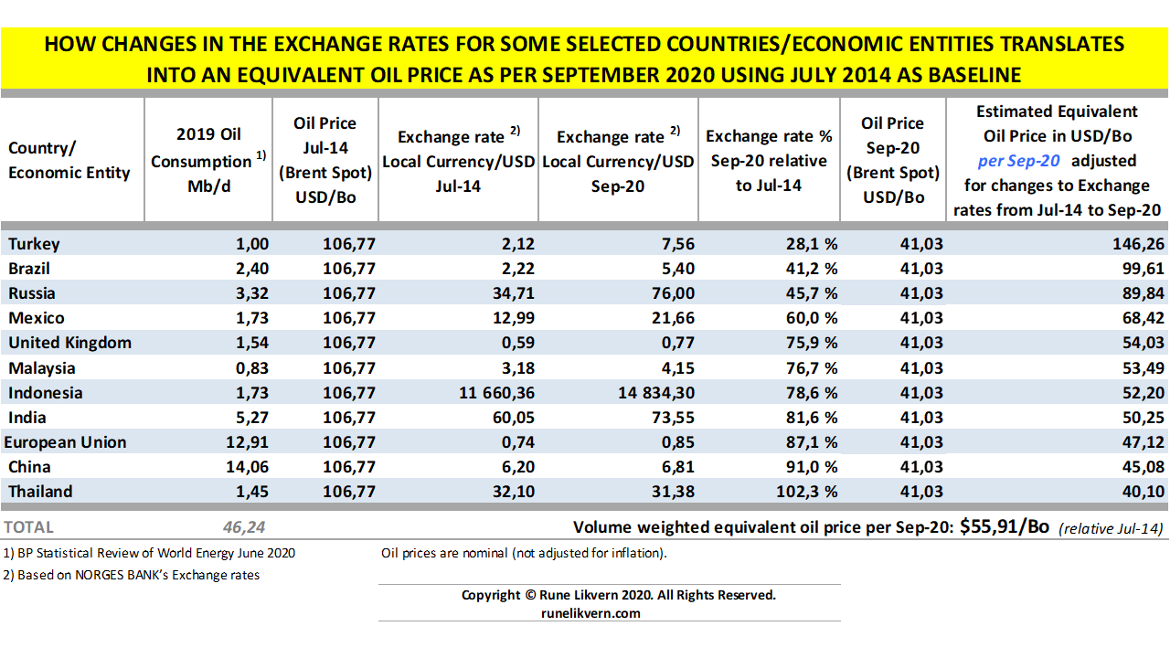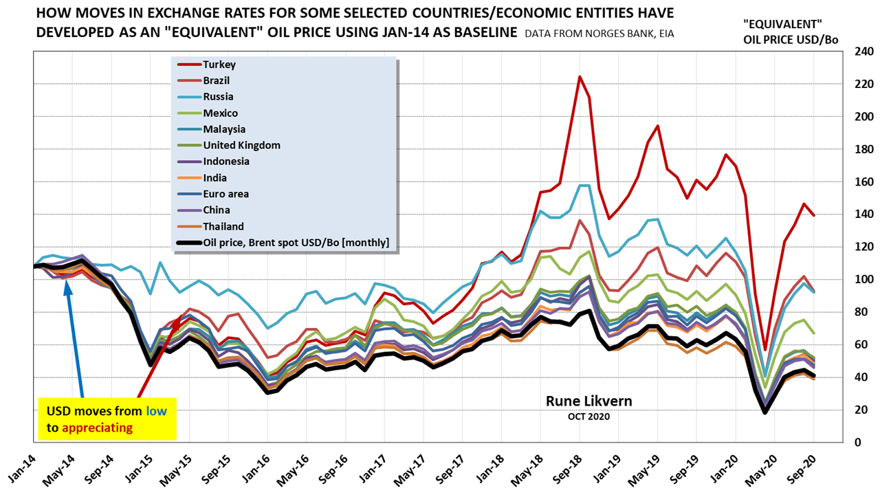 The term “equivalent” oil price in USD illustrates how (primarily) the strengthening of the USD per Sep-20 translates into the “equivalent” oil price in USD in local currencies using Jan-14 as a baseline.