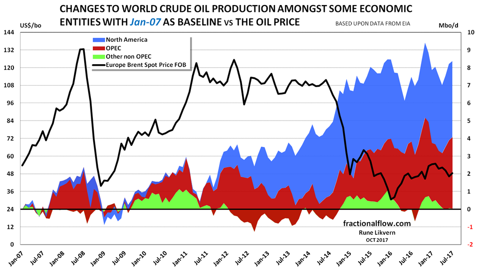 Figure 01: Figure 1: The stacked areas in the chart above shows changes to crude oil supplies split with North America [North America = Canada + Mexico + US], OPEC and other non OPEC [Other non OPEC = World – (OPEC + North America)] with January 2007 as a baseline and per July 2017. Developments in the oil price (Brent spot, black line) are shown against the left axis.It was the oil companies’ rapid growth in CAPEX leveraged by cheap debt [ref US Light Tight Oil (LTO)] and expectations of a sustained higher oil price that brought about a situation where supplies started to run ahead of consumption/demand that brought the oil price down. During the run up to the oil price collapse, supplies also grew from other non OPEC (ex North America) from developments sanctioned while the oil price was high and expected to remain so.
